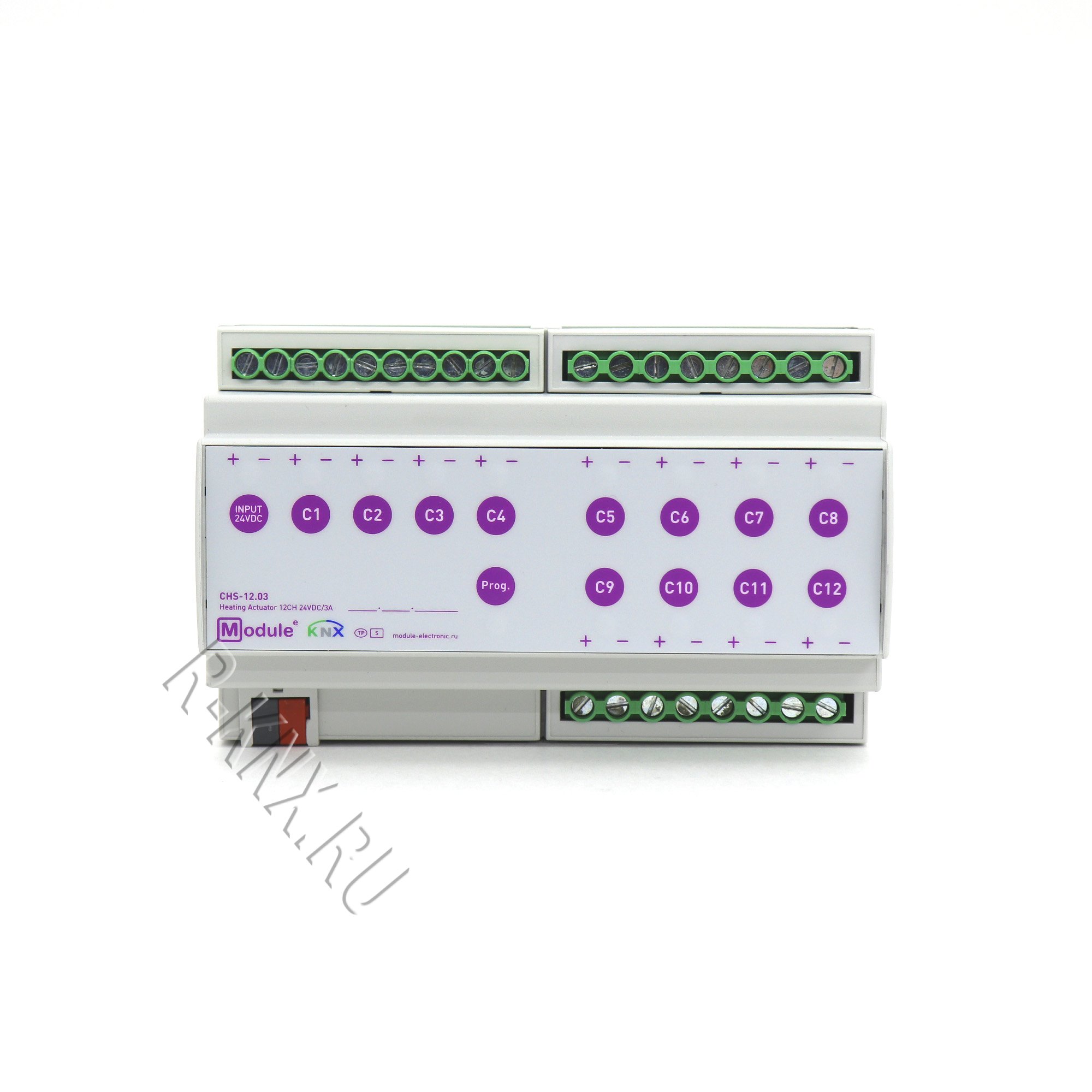 KNX актуатор отопления CHS-12.01 предназначен для управления водяными системами отопления с термоэлектрическими приводами клапанов с напряжением питания 24В DC.