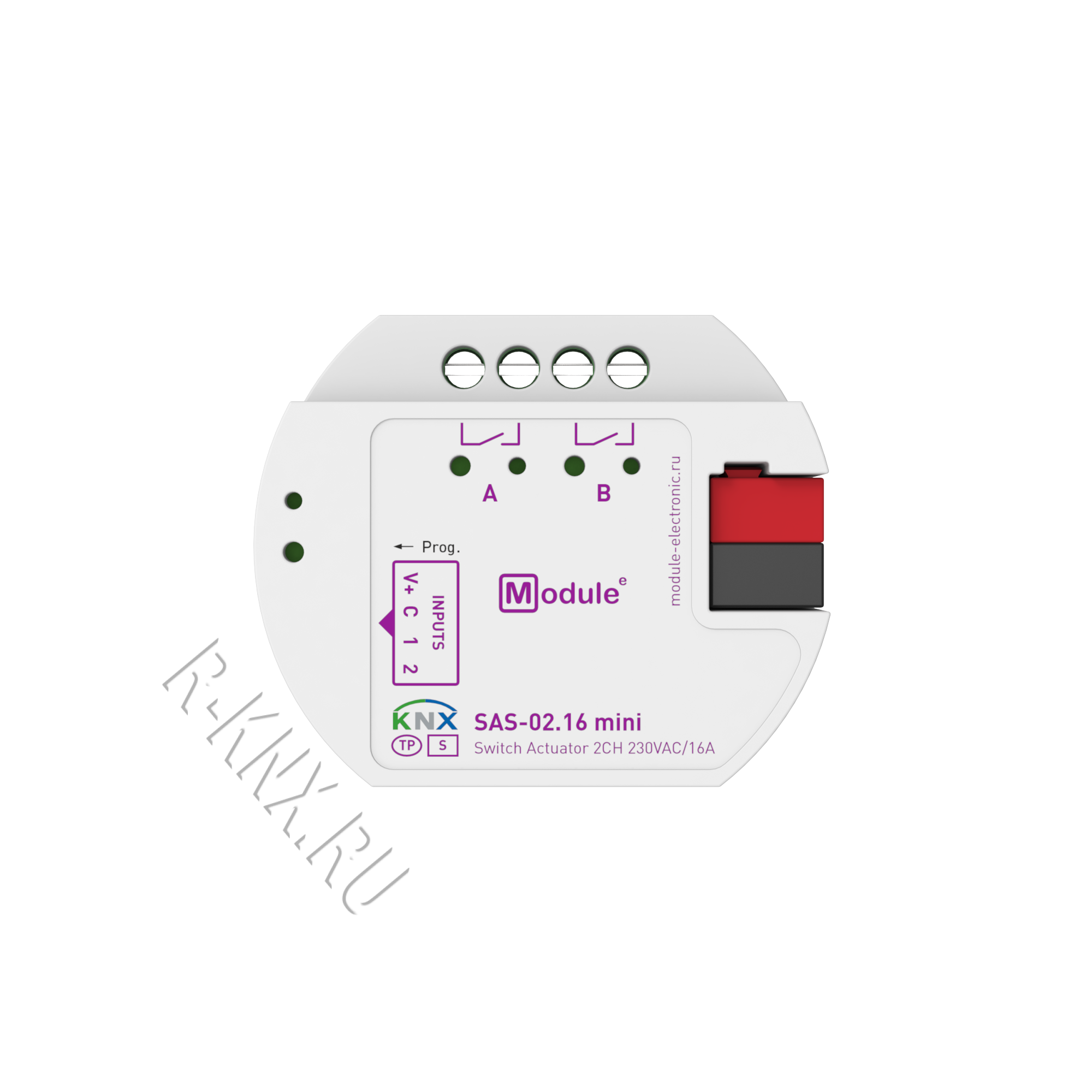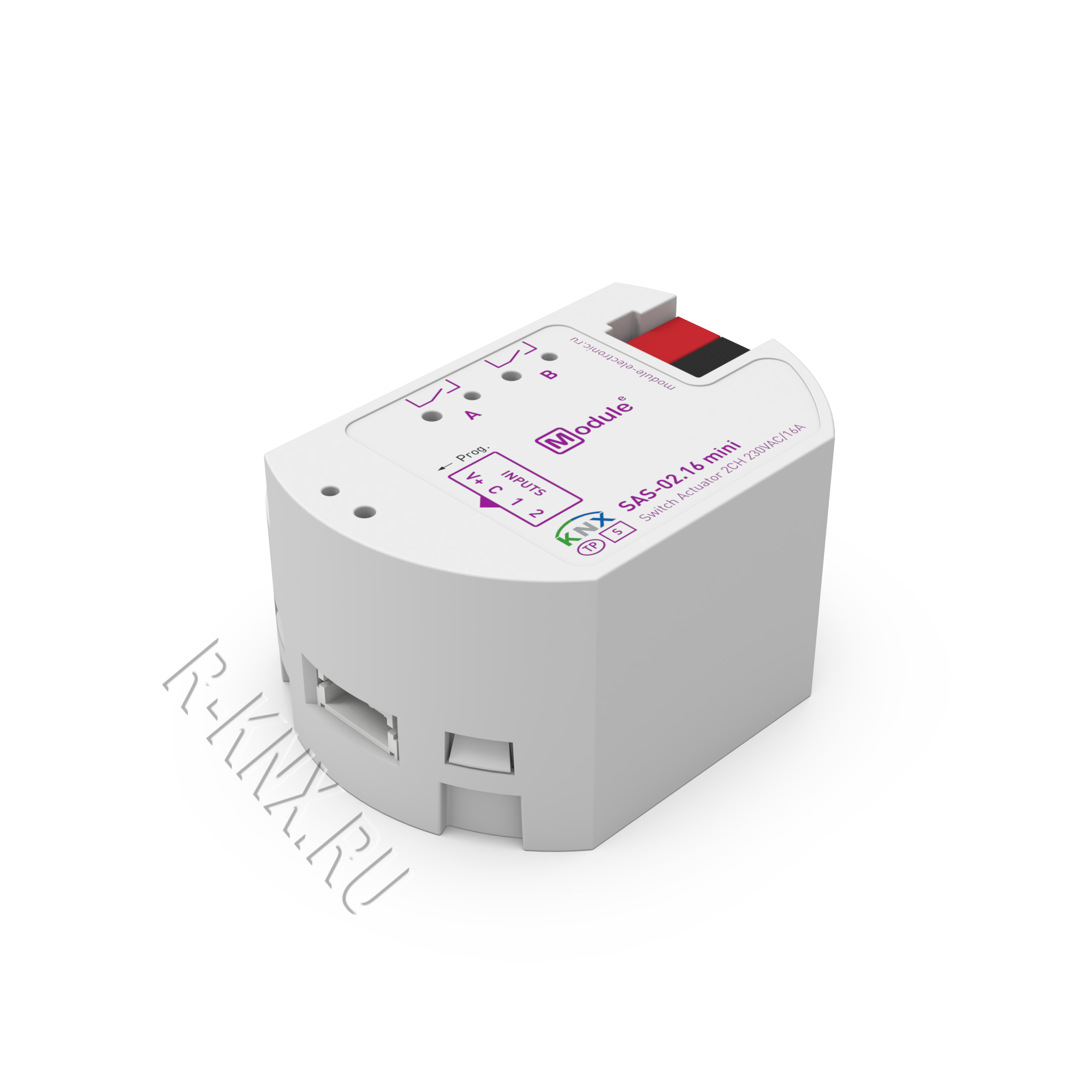 KNX релейный актуатор 2 канала SAS-02.16 mini принимает телеграммы KNX и переключает до 2 независимых нагрузок. Каждый выход имеет бистабильное реле, рассчитанное на высокие пусковые токи, и может управляться вручную.