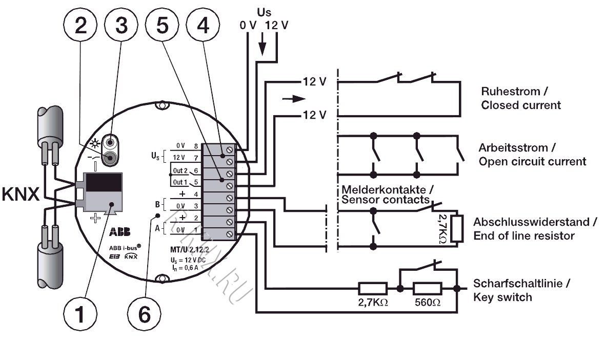 Используется в качестве устройства между датчиками системы безопасности и KNX. Устройство имеет 2 входа, так называемые зоны. Они используются для контроля подключенных пассивных датчиков, например , магнитных контактов и/или датчиков разбития стекла, и/или для подключения датчиков протечки. Устройство может использоваться как система с автономной логикой сигнализации, так и в сочетании с модулем безопасности или панелью охранной сигнализации с интерфейсом KNX