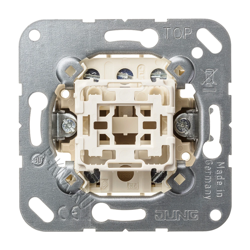 Jung 1 клавишный механизм, кнопок без фиксации, сухой контакт, 2 NO контакт, нормально разомкнутый, клавиша в нейтральном положении, винтовой зажим, 10 A 250 В ~