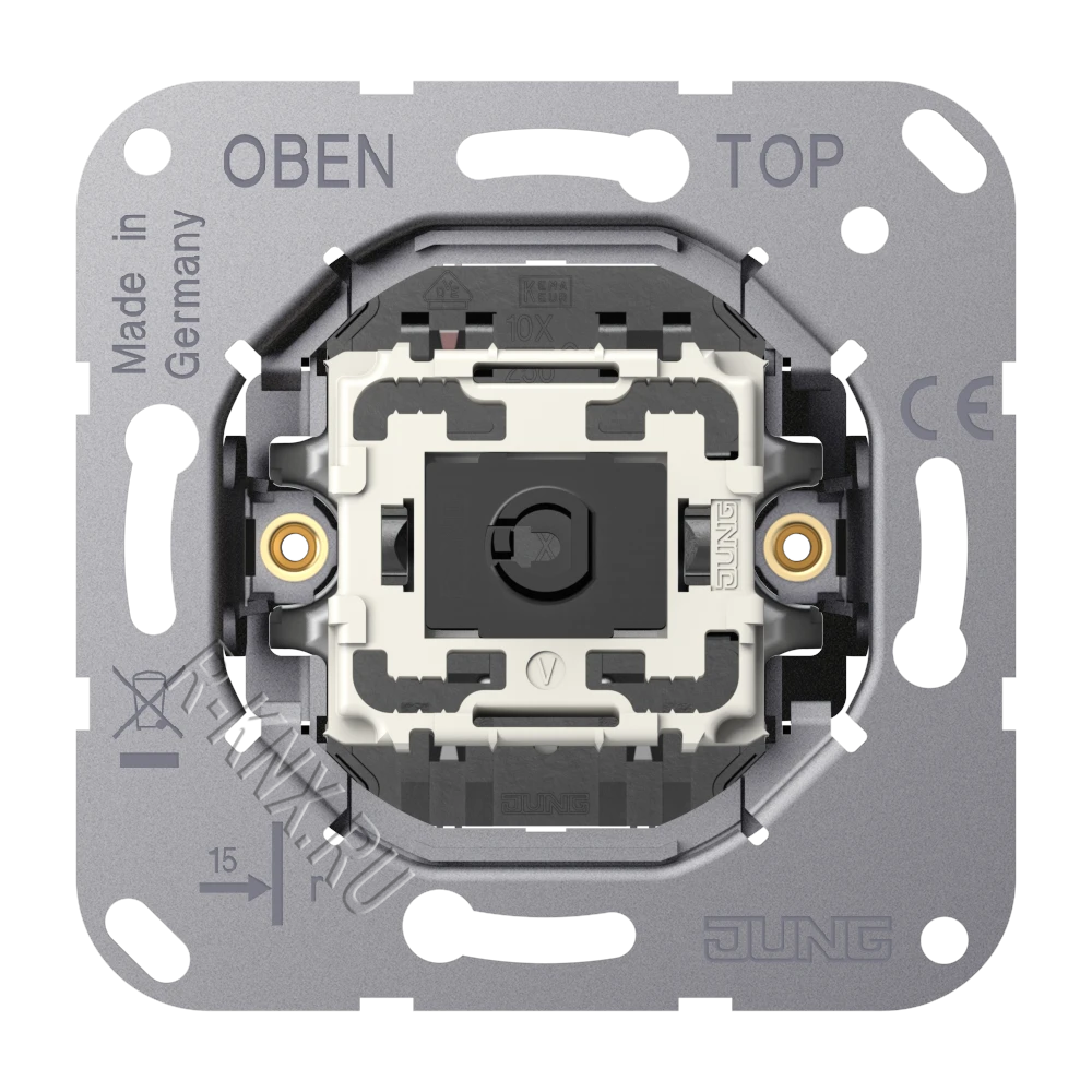 Jung 1 клавишный механизм, тумблерная кнопка без фиксации, сухой контакт, 2 NO контакт, нормально разомкнутый, клавиша в нейтральном положении, винтовой зажим, 10 A 250 В ~